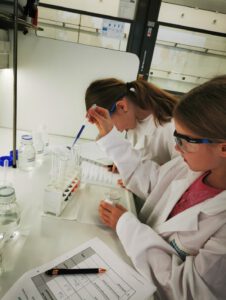 Am 15.01.2025 war die Klasse 4b zu Gast in der Knapsacker Kinderakademie. Nach einer Einführung über den Chemiepark erhielten wir unsere Ausrüstung für den Tag: Ein Chemielabor darf man nämlich nur mit Schutzkittel und Schutzbrille betreten. Wir fühlten uns direkt wie richtige Forscher! Wir wurden in drei Gruppen eingeteilt und durften an vier verschiedenen Station experimentieren.